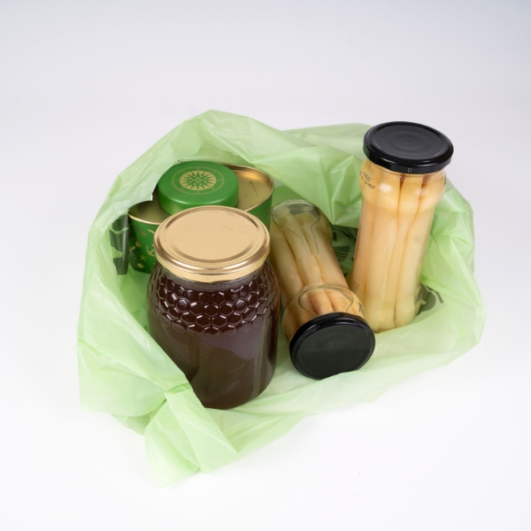 Estas bolsas están fabricadas por extrusión de soplado de granza 100% biodegradable y compostable según la norma UNE EN 13432 con un mínimo de un 40% de material biodegradable y compostable recuperado.